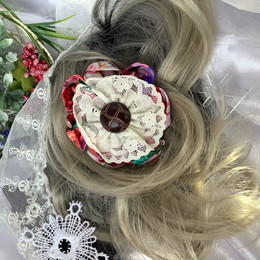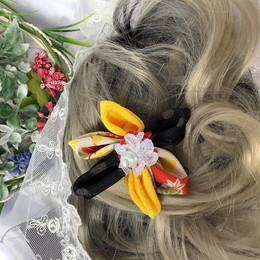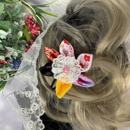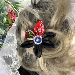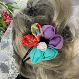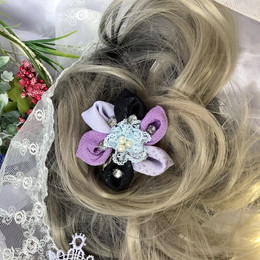 紫・薄紫・黒のちりめん生地を使っています。花びらの内側にはビーズが付いています。
