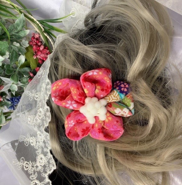 ピンクのちりめん、水色の和柄の生地を使っています。
