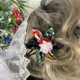 黒・赤・緑のちりめん、和柄の生地を使っています。