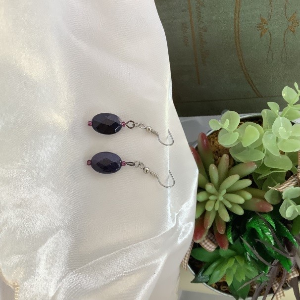 濃い紫の楕円形のビーズが付いています。