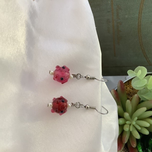 ピンクのぶたのトンボ玉が付いています。